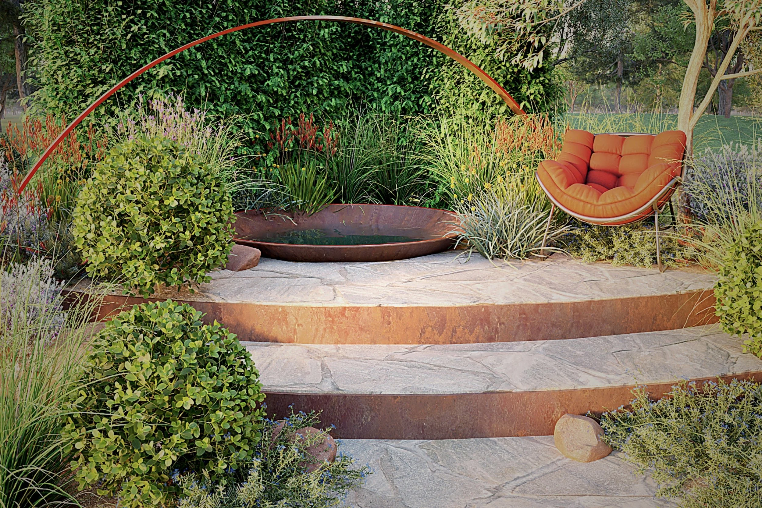 At its heart sits a reclaimed firepit repurposed as a wildlife water feature, inviting birds, insects, and small creatures to pause and drink. Arcing above the space, a left‑over steel piece bends gracefully across the entire garden, guiding the eye through every small detail and tying the whole composition together.